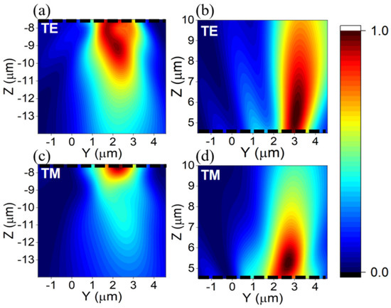 The normalized intensity of the Y−Z plane at the reflective and transmissive ends of the metasurface beam splitter under the incidence of x-polarized light at 1.55 μm wavelength demonstrates the deflection of the outgoing light. (a) The intensity of the Y−Z plane at the reflective end of the metasurface beam splitter under the incoming x-polarized light of 1.55 μm wavelength. (b) The intensity of the Y−Z plane at the transmissive end of the metasurface beam splitter under the incoming x-polarized light of 1.55 μm wavelength. (c) The intensity of the Y−Z plane at the reflective end of the metasurface beam splitter under the incoming y-polarized light of 1.55 μm wavelength. (d) The intensity of the Y−Z plane at the transmissive end of the metasurface beam splitter under the incoming y-polarized light at 1.55 μm.