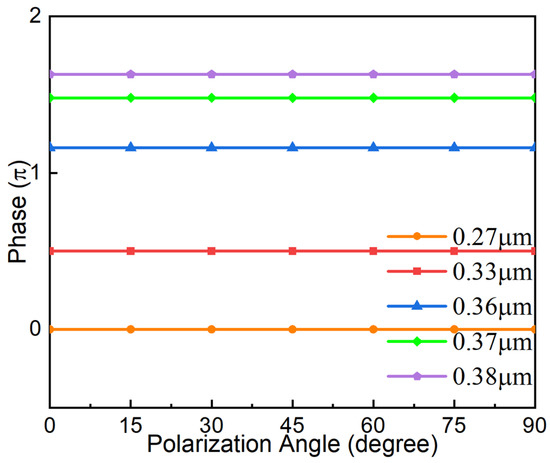 As shown in Figure 5, the nanocolumn’s additional phase shows almost no change to different linear polarization lights. Due to the fact that circular and elliptical polarization lights can be decomposed into two orthogonal linear polarization lights, the nanocolumn could maintain the polarization characteristics of the arbitrary polarization beam. As shown in Figure 6, the splitting ratio changes from 59%:41% to 48%:52% with the variation of the polarization angle. This is due to the fact that although the individual metasurface unit cell is polarization-independent, the splitting ratio variation arises because of the spatially polarized difference in the X and Y directions for the overall structure after the arrangement. It also conforms to the characteristics of the BS device, which is sensitive to the angle of incident polarization and changes the splitting ratio without changing the polarization of the outgoing light.