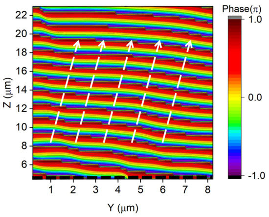 To investigate the operation of this metasurface under other size conditions, we used the designed 5 μm × 5 μm metasurface as a benchmark and combined four such metasurfaces into a 10 μm × 10 μm metasurface array. Eventually, an isophase plane tilt circumstance appears at the transmissive end of the metasurface, as shown in Figure 7. This shows that different-sized metasurface arrays are likely to be constructed to match different-sized application conditions.