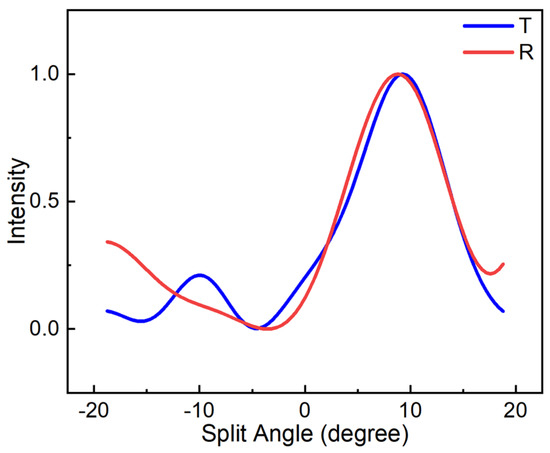 In order to calculate the double-ended outgoing angle, we normalized the intensity distribution near the maximum of the outgoing light field intensity along the y-axis and calculated the corresponding emergence angle, and the results are shown in Figure 8. The angle of emergence at the transmissive end is 9.2°, and it is 8.8° at the reflective end. According to Equation (3), the expected inclination angle of the isophase plane is 83.6°, and the propagation angle perpendicular to the isophase plane is 6.4°, which is similar to the simulation measurement results; at the same time, it is known that the maximum design deflection angle is 26.5°, which is reached when the additional phase difference is . The maximum deflection angle may be modified in the actual design by considering the metasurface material, the unit cell period, and the working waveband, all of which have certain design flexibility.