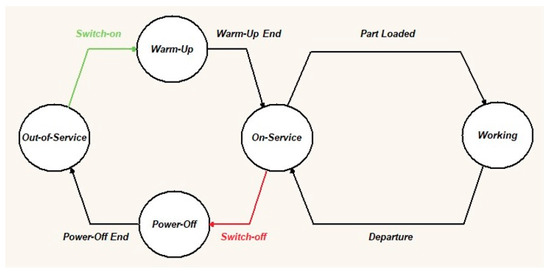 A shutdown policy is characterized by two decisions: what is the condition for shutting down and the condition for turning on the machine? Figure 1 shows the activities to implement a switch-off policy; when a machine loads a part, the state runs until the end of the machining time. So, the machine is “on service” and can either load another part or shut down depending on the policy being enforced. If the machine shuts down, when the policy decides to turn it on, it is considered a warm-up period to transition to the “on service” state. The shutdown policy must consider when to shut down when the machine is in the “in service” state or when to power back on when the machine is in the out-of-service state.