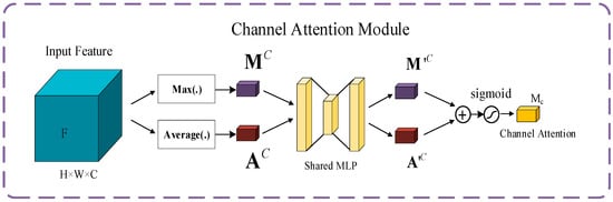 where represents the input feature map, represents average pooled feature vectors, represents the maximum pooling vectors, and and represent the weight parameter of the shared MLP, which represents the sigmoid activation function.