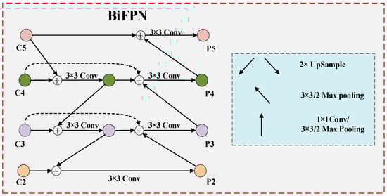Different levels of features are directly added when performing feature fusion in an FPN; this operation causes different levels of features to have the same weight. This, in turn, ensures that different feature layers contribute equally to the detection results. By adding a top-down path, shallow features can fuse powerful semantic information with deep features. However, because of the relatively large number of convolutions from the bottom to the top layer, dozens or even hundreds of convolution layers are required; thus, many detailed features of the target are lost in the process. Therefore, a lack of more specific details on deep features affects the detection accuracy of the network. BiFPN adds low-to-top channels and weighted fusion, which compensates for the lack of detailed information and produces more effective multiscale feature fusion.