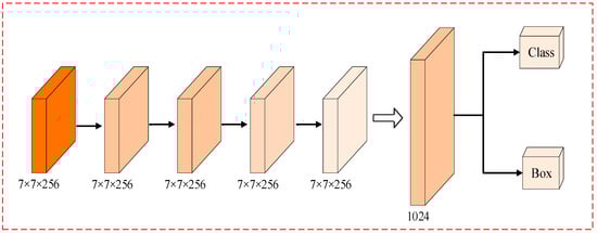 The mask head of the Mask Scoring R-CNN method requires a classifier head to provide a category and bounding box for small targets, where the bounding box is used to clip the corresponding feature layer. It is then sent to the network for segmentation, and the final target mask is selected according to the target category. During detection, the original target detector predicts numerous target frames containing small targets; however, these target frames are redundant, and some target frames highly overlap. Therefore, numerous duplicated boxes must be filtered out in a nonmaximal, suppressed manner. We believe that the input feature involves numerous bounding box information because it is obtained through dozens of convolution layers. In this study, we adopted a deeper network structure (Figure 6). Four convolutions were used to replace the first fully connected layer to recode the input features. To weaken the influence of external information during detection and highlight the target features, the output size of each convolution layer is always consistent with the input [42].