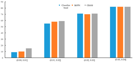 Classifier head: From Table 4, it is visible that the detection head added in this study also had noticeable effects. The detection accuracy in the range of (0, 0.01) was improved by 2%, in (0.01, 0.02) by 7.58%, and the total number of detections was increased by nine small targets.