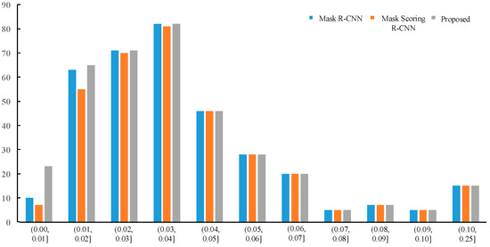 Compared to the Mask R-CNN experiment, our experimental results contained 17 pictures with undetectable small targets, while the Mask R-CNN experimental results contained 24 pictures with undetectable small targets. The statistics of the Mask R-CNN detection results are shown in Figure 8. As shown in Figure 10, the comparison shows that in the (0, 0.01) interval, the accuracy of our results was 23%, whereas that of the Mask R-CNN was 10%; further, the accuracy of the results obtained by the Mask Scoring R-CNN was 7%. When the proportion of small targets was in the (0.01, 0.02) interval, the accuracy rate of our experiment was 98.48%, while the accuracy of Mask R-CNN detection results was 95.45% and the correct rate of Mask Scoring R-CNN detection results was 83.33%, and the correct rate in other proportions was 100%. Therefore, the detection results obtained by this method are much higher than those obtained using the traditional small-target detection method.