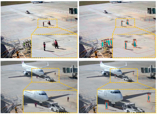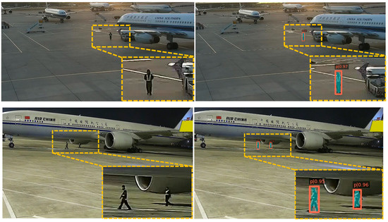 To verify the effectiveness of the proposed method, it was applied to a real airport surface to detect apron personnel. All staff in the figures meet the definition of small targets. As can be seen in Figure 11, all the staff were detected with high accuracy, which proves that the proposed method has a desirable effect on the detection accuracy of small targets on the airport apron. Note that the left side presents the original figure, and the image detected by the proposed method is presented on the right side.