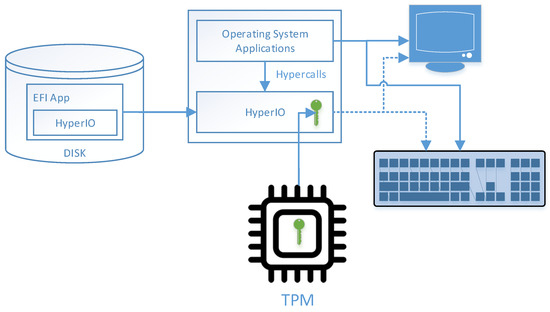 HyperIO’s architecture. HyperIO is embedded in an EFI application, which is stored on a disk. During the boot, the EFI application is loaded, HyperIO is initialized and its private key is loaded from the TPM. HyperIO executes in an isolated execution environment, in which it can store its secret private key. HyperIO can obtain partial control over the screen and keyboard (depicted by dashed arrows), while the operating system has direct access to them (depicted by solid arrows). The operating system and the applications can communicate with the hypervisor via the exported hypercalls.