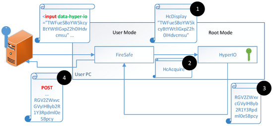 FireSafe acts as a mediator between the server and HyperIO by issuing hypercalls in response to various events occurring on the HTML page sent by the server. The server submits its request for secure input and output by embedding a “data-hyper-io” attribute in an HTML tag. When an event occurs in such a tag, FireSafe issues a hypercall. Since web browsers ignore the “data-*” attributes, the web server can send the same HTML page to a FireSafe-enabled web browser and a regular web browser. The page will be displayed correctly, but without FireSafe, the user cannot display the sensitive information sent by the server.