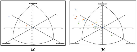 Rugby players somatochart. (a) Total sample (grey dot), forwards (blue dot), and backs (orange dot); (b) Individual somatochart of the players.