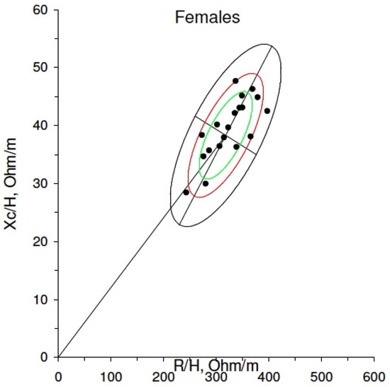 The BIVA (classic BIVA) is a semiquantitative analysis method that also allows the determination of changes in body fluids, hydration status, and body cell mass. It is based on the analysis of the impedance vectors, normalised to standing height (R/H and Xc/H). These vectors are represented in an RXc graph (in terms of age, race, and sex), which is made up of three concentric ellipses corresponding to the 50th, 75th, and 95th percentiles of the normal distribution of the values of the reference population (tolerance ellipses) [19]. Vector displacements parallel to the major axis of tolerance ellipses indicate changes in hydration status, dehydration with long vectors, and hyperhydration with short vectors, while vector displacements parallel to the short axis indicate changes in body cell mass and in the relationship between extracellular water (ECW)/intracellular water (ICW) [18,19]. The classic BIVA does not make assumptions about body compartments, body mass, geometry, or hydration, nor is it subject to the error sources of other modalities of BIA.