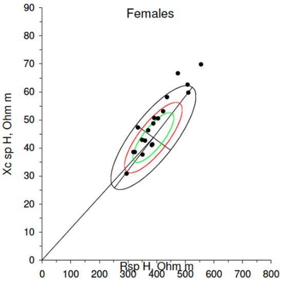 For the classic BIVA, the components of the impedance vector (R and Xc) were standardised by the heights of the subjects (R/H (ohm/m) and Xc/H (ohm/m), respectively) and were represented on an R-Xc graph (abscissa axis: R/H; ordinate axis: Xc/H). The PA (degrees) was calculated as arc tangent (Xc/R). Individual impedance vectors were compared with the vector distribution from Campa et al.’s reference sports population (tolerance ellipses at 50%, 75%, and 95%) [37]. For the BIVA-sp approach, R and Xc were corrected by multiplying by A/L (Rsp and Xcsp), where A is the cross-sectional area (m2) estimated as 0.45 upper arm area + 0.10 waist area + 0.45 calf area, and L is the height multiplied by 1.1 (m). The segment areas were calculated as C2/4π, where C (m) is the circumference of the upper arm, waist, or calf. The length of the vector (Zsp) was calculated as (Rsp2 + Xcsp2)0.5. Specific values were rescaled by a factor of 100 [20]. Individual specific impedance vectors were compared with the vector distribution from the reference sports population (tolerance ellipses at 50%, 75%, and 95%) [38]. Finally, to compare the subgroups, the 95% confidence ellipses for mean vectors of the groups (classic and specific BIVA) were drawn.