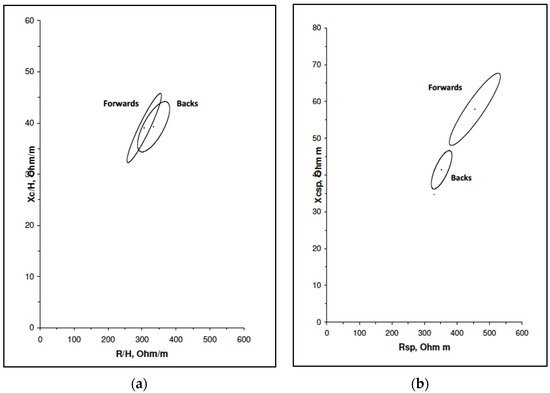 Classic BIVA did not detect differences in BC according to the player’s position, which is shown by both the individual impedance vector distribution (Figure 3) and the mean impedance vector distribution of each subgroup (confidence ellipses, Figure 4a). This was an expected result, given that Marini et al. [54] proved that classic BIVA detects differences in TBW but not in FM%. The two studied subgroups of players differ in fat mass but not in TBW, as is shown by the mean impedance vectors (Figure 4a) and the Z/H values (Table 3).