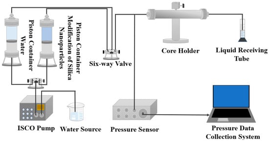 The confining pressure of the core was set as 8 MPa, and the core was vacuum dried at 100 °C for 24 h. First, the mass (W1) of the dry core was measured, and it was immersed in water for 24 h. Then, the mass (W2) of the core under a wet state was measured. As shown in Figure 1, the pipeline of the displacement experiment was connected. Brine was injected into the core at a constant flow rate of 0.1 mL/min, and the displacement pressure was recorded until the pressure P1 stabilized. Water permeability was then calculated. The modified nano-SiO2 dispersion of 0.5 PV was injected at a constant flow rate of 0.1 mL/min and aged at 60 °C for 48 h. During the subsequent water flooding, brine was injected at a constant flow rate of 0.1 mL/min until the pressure was stable after water flooding, and the stable pressure P2 was recorded. Subsequently, 30 PV of brine was injected at a constant flow rate of 0.1 mL/min to flush the core, and the pressure during displacement was recorded to evaluate the depressurization and boosting effect as well as the erosion resistance of the modified nano-SiO2.