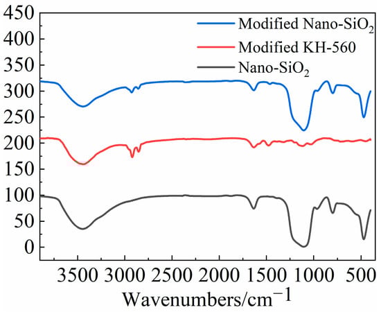 The FR-IR spectra of nano-SiO2, modified KH-560 and modified nano-SiO2 are presented in Figure 2. The characteristic peaks at 472 and 1105 cm−1 belong to the bending vibration and stretching vibration of the Si-O. The antisymmetric tensile vibration absorption peak and bending vibration absorption peak of the hydroxyl emerged at 3446 and 1633 cm−1. Compared with the data of nano-SiO2, the peak intensity at 3446 cm−1 of the modified nano-SiO2 decreased, indicating that the hydroxyl on the nano-SiO2 had reacted. In addition, the characteristic peaks of methyl and methylene can be found at 2925 and 2858 cm−1. The two characteristic peaks mentioned above can be simultaneously observed in the spectra of modified nano-SiO2 and modified KH-560, indicating that the modified KH-560 successfully grafted onto the modified nano-SiO2.
