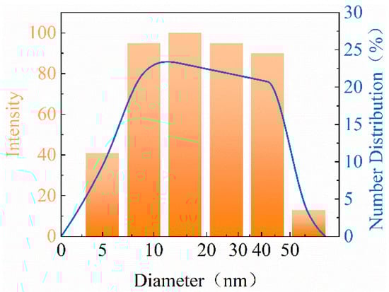 Nano-SiO2 has strong hydrophilic properties, and it easily agglomerates between particles, thereby enlarging the particle radius. Figure 3 displays the particle size distribution of modified nano-SiO2. All of the particle sizes of the modified nano-SiO2 were less than 60 nm, and the median particle size was 15 nm, in line with the nanoparticle size range. The modified nano-SiO2 had less agglomeration, and the obtained particles had smaller and uniform particle size. When it was injected into low-permeability oil reservoirs, it was not easy to block and it more easily adsorbed onto the surface of rock pores evenly.
