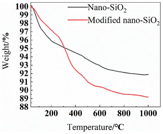 Figure 4 shows the TGA of SiO2 before and after modification. With increased temperature, the weight of the sample gradually decreased, and the mass change with temperature was divided mostly into two stages. In the first stage, with increased temperature from 25 °C to 120 °C, the mass of the sample decreased from 100% to 98%, which was primarily caused by the loss in adsorbed water on the sample surface. In the second stage, with increased temperature from 120 °C to 1000 °C, the weight of nano-SiO2 decreased from 98% to 92%, which was due to the weight change caused by the dehydration and polycondensation of the hydroxyl groups on the nano-SiO2 surface. However, the weight of the modified nano-SiO2 decreased from 98% to 89% with increased temperature. On the one hand, this was due to the dehydration and polycondensation of the unreacted hydroxyl groups on the surface of the modified nano-SiO2, the same as with the above-mentioned SiO2. On the other hand, the weight of the modified KH560 grafted onto the surface of SiO2 was further reduced due to the fracture of the modified KH560 owing to the excessive temperature. At 1000 °C, the weight of SiO2 before and after modification differed by 3%, indicating that 3% of KH560 was grafted onto the surface of SiO2.