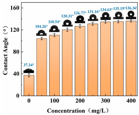 Wettability is very important as it directly affects the effect of pressure reduction and injection. Core wettability was evaluated by measuring the contact angle. Figure 5 shows the contact angles of core slices immersed in modified nano-SiO2 dispersion and saline. In the control experiment of core sections soaked in salt water, the core contact angle was 37.34°, indicating that the initial surface wettability of the core was hydrophilic. However, the contact angle of the core slices immersed in the modified nano-SiO2 dispersion solution was 104.26°, indicating that the modified nano-SiO2 can change the core from hydrophilic wetting to hydrophobic wetting, and the change in wettability can reduce the adhesion force of the rock surface to water to promote water flow. Consequently, the effect of lowering the pressure and increasing injection was achieved. With an increased concentration of modified nano-SiO2, the contact angle increased from 104.26° to 136.36° and gradually became stable. This finding indicated that with increased concentration, the adsorption amount on the core surface increased, and the hydrophobic degree on the core surface also increased. However, with a further increased concentration of modified nano-SiO2, the adsorption gradually became saturated. The adsorption capacity was basically unchanged and the contact angle tended to be stable.