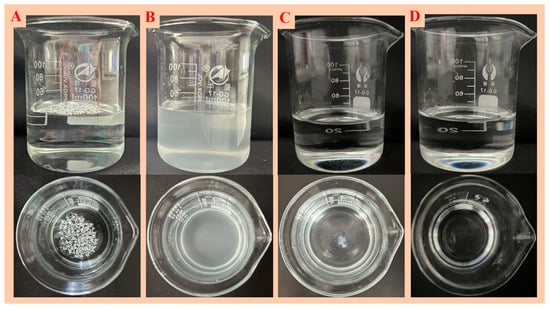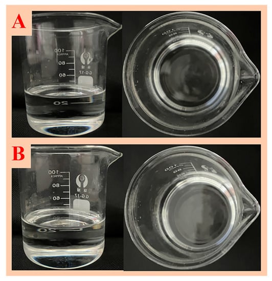A large amount of working fluid is generally used on site; so, using kerosene as a dispersant is costly and has high safety risks during storage and transportation. Therefore, the dispersion system of adding NaOH to the surfactant aqueous solution needed to be explored. As shown in Figure 8, the dispersion of the aqueous surfactant dispersion system without NaOH was turbid, whereas the dispersion of the aqueous surfactant dispersion system with NaOH was well dispersed, and the dispersion was clear and transparent. Then, the dispersion before and after NaOH adjustment was stored for 30 days. As shown in Figure 7 and Figure 8, the precipitation formed in the dispersion system without NaOH, whereas the dispersion with NaOH remained clear and transparent.