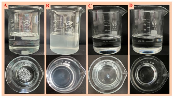 Modified nano-SiO2 was dispersed in pure water, TX-100, ethanol and kerosene to explore the dispersibility of nano-SiO2. As shown in Figure 6, due to the large specific surface area and high surface energy of modified nano-SiO2, it was unable to disperse in water and agglomerate seriously. In ethanol solution, the dispersion effect was poor, and some modified nano-SiO2 agglomerated and precipitated. In TX-100, the dispersion effect of modified nano-SiO2 was better, but the solution was cloudy. The nano-SiO2 had good dispersibility in the kerosene dispersion system, and the solution was clear and transparent.