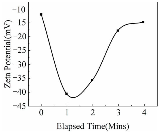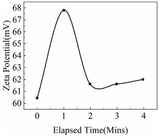 Nano-SiO2 dispersion is a colloidal system, and zeta potential is also an important parameter affecting its stability. In addition to the stability experiments mentioned above, the zeta potentials of the surfactant aqueous dispersions before and after the introduction of NaOH were also measured. The larger absolute value of the zeta potential indicated that the system was more stable. As shown in Figure 9 and Figure 10, after NaOH addition, the zeta potential of the system increased from −24.1 mV to 62.7 mV. Analysis revealed that surfactant TX-100 can form a steric hindrance effect through adsorption onto the surface of modified nano-SiO2, which can prevent mutual collision and coalescence between particles and improve the system stability. After adding NaOH, OH− adsorbed onto the surface of the modified nano-SiO2 through hydrogen bonds, whereas Na+ was arranged around the modified nano-SiO2 via diffusion, forming a diffusion electric double layer. Consequently, the charge on the surface of nano-SiO2 increased, which improved the repulsion between particles and the system stability.