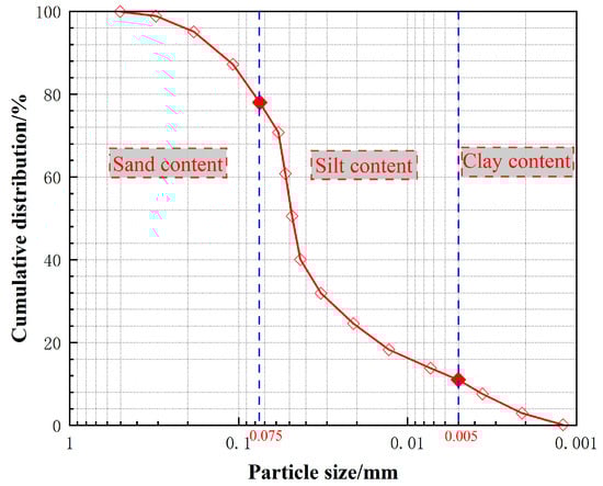 This experiment used tailing silt acquired from an iron tailing pond in Sichuan, China. The material used was the primary dam-building material for tailing dams. Figure 1 shows the grading analysis results for the tailing silt sample. The physical properties were as follows: sand content, 22%; silt content, 67%; clay content, 11%; plasticity limit,, 18.2%; liquid limit, , 27.3%; and plasticity index, , 9.1. The particle size primarily ranged from 0.005 to 0.075 mm. Because the content of particles with a size greater than 0.075 mm was less than 50% and the plasticity index, , was less than 10, the sample used in this experiment was defined as tailing silt. The uniformity coefficient, Cu, of the sample was 10.8, and the curvature coefficient, Cc, was 4.1. The analysis revealed that the particle size distribution of the sample was relatively concentrated, the particle distribution was not uniform, and the grading curve was not continuous, which is not conducive to the stability of the tailing pond [21].