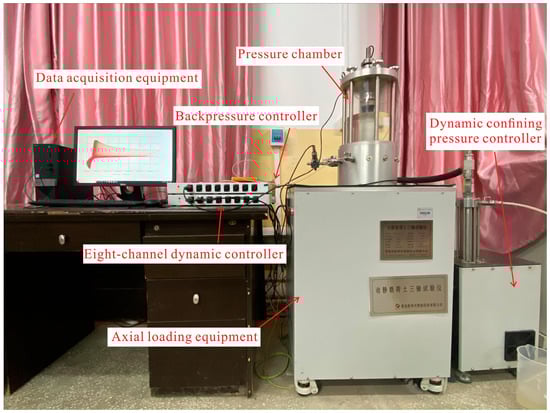 This test used the KTL-DYN10 dynamic triaxial apparatus(Xian KTL Instruments Technology Company, Xian, China), as shown in Figure 2. The test instrument is mainly composed of a hardware system and a software system. The hardware system mainly includes data acquisition equipment, a pressure chamber, a back pressure controller, an eight-channel dynamic controller, axial loading equipment, and a dynamic confining pressure controller. The software system mainly includes GeoSmartLab software matched with the instrument. The device is capable of measuring the soil’s pore pressure and strain under cyclic stress. The sensors function normally, and the data are highly reliable.