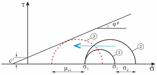 The static limit equilibrium of the material is applicable to the dynamic test as well, and the Mohr–Coulomb failure envelope of the dynamic load and static load is the same. As shown in Figure 3, stress circle ① represents the stress state before vibration and stress circle ② represents the maximum stress circle in dynamic load application (i.e., the stress circle whose dynamic stress is equal to its amplitude). During the application of dynamic load, the pore pressure in the sample continues to develop and stress circle ② continues to move to the failure envelope. When the pore pressure reaches the critical value, stress circle ③ is tangential to the failure envelope. According to limit equilibrium theory, the tailing silt reaches the failure state in this condition.