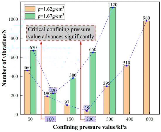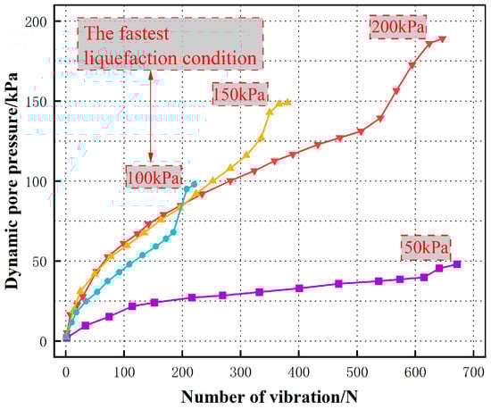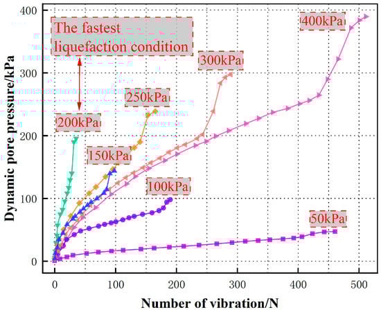The number of vibrations necessary for liquefaction significantly rose as the confining pressure rose. When was 600 kPa, the number of vibrations necessary for liquefaction was 980, and the sample did not liquefy at . This demonstrates that the impact of consolidation confining pressure on the sample’s anti-liquefaction ability always dominates at high confining pressure and the anti-liquefaction potential of the sample gradually increases with the continuous increase in confining pressure.