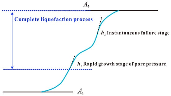 For the cumulative pore pressure growth model of saturated soil, several scholars have performed extensive research and suggested corresponding dynamic pore pressure rise models. Among these, the inverse sine function model suggested by Seed et al. [23] is one of the more typical models. However, Seed’s proposed development model is only applicable to the cumulative pore pressure growth model in a single development stage, and the description of the cumulative pore pressure growth in the multiple stages of tailing silt is not ideal. In addition, Seed and others have generally used the vibration ratio as an independent variable to study the cumulative pore pressure development law, which cannot better reflect the difference in pore pressure curves. Therefore, this paper used the vibration number N as an independent variable to summarize the development law of pore pressure and found that its growth trend is consistent with the h1–A2 segment in the BiDoseResp function (as shown in Figure 7 and Formula (3)).