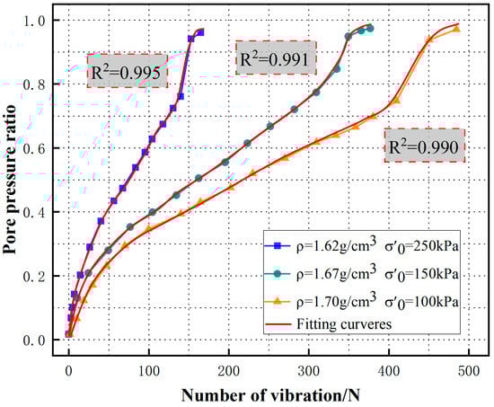 In Formula (3), A1, A2, c, v1, v2, h1, and h2 are the model parameters, where A1 represents the initial value of the function development, A2 represents the final value of the function, h1 represents the slope of the rapid growth stage of pore pressure, h2 represents the slope of the instantaneous failure stage, and c, v1, and v2 represent other parameters of the fitting function. To fit the pore pressure ratio–vibration number curves of saturated silty soil at different densities, the BiDoseResp function was used. Owing to space limitation, Figure 8 only shows the pore pressure ratio–vibration number curves at and , and , and and . The specific fitting parameters under other test conditions are shown in Table 2. The fluctuation ranges of the test parameters v1 and v2 in each group were large, the other parameters’ fluctuation range was quite limited, and R2 surpassed 0.990. The fitting effect achieved was good. As a result, the model may be deemed applicable to the cumulative pore pressure development of tailing silt at different densities. In addition, as shown in Table 2, at and , the parameter h1 was greater than that at , indicating that the pore pressure development rate increases with an increase in sample density when the cyclic load begins to be applicable; this is because the particle connection is relatively stronger and the pore is small at high density. When cyclic load is applied, the volume of pore pressure dissipation is limited, causing the pore pressure to rise fast at first.
