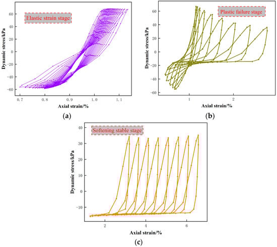 As shown in Figure 9, at and , the hysteresis curves of typical tailing silt at each stage showed axial compression as a whole cyclic loading and the strain increased with an increase in cyclic vibrations, which was followed by plastic failure; this reflects the deformation accumulation characteristics of tailing silt. With the application of cyclic load, the hysteresis curves of typical tailing silt can be divided into the elastic strain stage, plastic failure stage, and softening stable stage. As shown in Figure 9a, at the elastic strain stage, the overall shape of the hysteresis curves was relatively regular and symmetrical about the origin, indicating that the strain produced by tailing silt with an increase in the number of vibrations in the elastic strain stage is small and it can withstand high dynamic load and exhibit high liquefaction resistance. Additionally, this stage accounted for the largest number of vibrations required for the liquefaction of the sample. At this stage, the soil particles were primarily staggered and the deformation was small. Figure 9b depicts the plastic failure stage. At this stage, the maximum value of the hysteresis curves steadily diminished, the sample’s capacity to endure dynamic stress gradually declined, and the strain gradually increased. In addition, the tailing silt exhibited irreversible plastic deformation and obvious damage. The effective tension between many particles eventually passed to the pore water pressure, reducing the duration, and the sample entered the softening stable stage (as shown in Figure 9c) after a given number of vibrations. At this stage, the tailing silt accumulated multiple irreversible plastic deformations and the sample structure was completely deformed and showed softening. In addition, the dynamic stress of the sample remained unchanged with an increase in the number of vibrations and the dynamic strain increased steadily. This shows that the sample exhibits a certain cyclic activity.