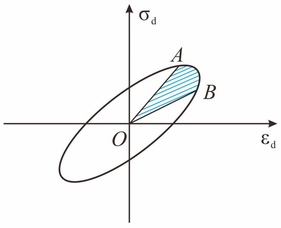 In this experiment, 20 sets of dynamic stress–strain points were collected per vibration and corresponding polygons were formed. When the load frequency is 1 Hz, the independence of the area calculation of each vibration can be guaranteed. The area of dynamic stress–strain hysteresis curves can be calculated by calculating the polygon area. The calculation of the area of triangle OAB in Figure 10 is shown in Formula (5).