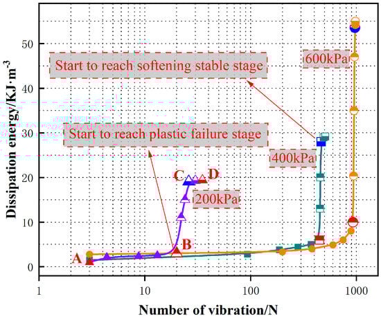 Figure 11 shows the dissipated energy, Si, per cycle at = 200 kPa, 400 kPa, and 600 kPa. As the number of cyclic vibrations grew, the energy dissipated with each vibration of the tailing silt gradually increased and tended to stabilize. Based on the size and trend of energy dissipation, the process can be divided into three stages: AB, BC, and CD. In Figure 11, section AB corresponds to the elastic strain stage at the early stage of cyclic loading. At this stage, the hysteresis curves gradually shifted and diffused based on the initial shape, and the maximum positive strain increased marginally. The area of the hysteresis curves remained unchanged or increased slightly, and the energy dissipation in the corresponding sample increased slightly, which manifested as the early vibration density of the tailing silt. Section BC corresponds to the plastic failure stage, at which point the area of the hysteresis curves increased rapidly and the corresponding energy dissipation also increased rapidly. This stage began to progress rapidly from point B to C at the softening stable stage of the sample, and the deformation resistance of the sample weakened considerably. Section CD corresponds to the softening stable stage. At this stage, the sample exhibited complete liquefaction, the area of the hysteresis curves decreased marginally and tended to stabilize, and the energy dissipation in the corresponding sample decreased marginally and tended toward constancy, exhibiting a certain cyclic tendency.