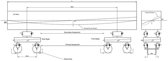 The equations for the combined flexural–rigid motion of a vehicle body are formulated using three degrees of freedom (DOF). A schematic representation of the vehicle is shown in Figure 1. Presumably, the vehicle body and each bogie frame have three DOF of rigid body motion. These DOF are called pitch, vertical, and roll motions, respectively. In addition, flexible body motion is considered for the vehicle’s body, as described in the preceding section. The wheelsets are considered rigid bodies, since they only have two DOF: the ability to move in a vertical and roll motion. The normal contact between the wheels and the rail is represented in this model as a linear spring.