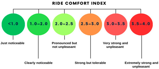 The Sperling Ride Index [24] is calculated by first measuring the vertical acceleration experienced by a passenger on a train using an accelerometer. The acceleration is then filtered to remove high-frequency noise and vibrations. The filtered acceleration data are then integrated twice to obtain the displacement of the passenger in the vertical direction. This displacement is then compared to a standardized curve representing passengers’ minimum discomfort threshold. The level of ride comfort may be determined with the help of Equation (39) [3].