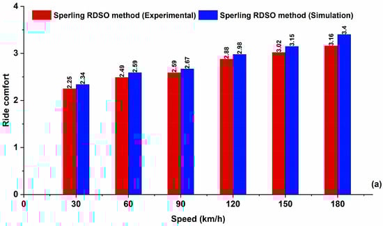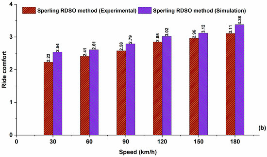 The frame acceleration passband frequency range is 0.5 to 12 Hz, while the frame acceleration sampling frequency is 2 kHz. The acceleration measurement device has a passband frequency range of 0.1–200 Hz and a sampling frequency of 1 kHz. An oscillation test performed on the real-world environment by RDSO validates the numerical model. The proposed numerical passive model’s ride comfort for passengers is particularly compared to the experimental data acquired by RDSO [6]. RDSO was the organization that conducted the experiments. Oscillation trials are a form of on-track testing performed using a prototype coach that is equipped to record displacement, acceleration, events, and speed. Throughout the oscillation tests, the maximum vertical and lateral ride indices in both unladen and laden states were determined. The RDSO Sperling Ride Index method was used to compute the riding index. The value of the riding index, according to the RDSO Sperling Ride Index, was lower than 2.75 but still between 3.25 and 3.50 at most, with 3.25 being the preferred range. It was determined that the riding behavior of the same was adequate [36]. Yet, there is room for improvement in the ride index values. The experimental ride index and the numerical ride index are compared in Figure 4, which illustrates the comparison results under unladen and laden settings, respectively. Additionally, the findings generated from the numerical analysis of the suggested model have attained an excellent general agreement with the experimentally measured results. This can be seen by comparing the two sets of data. The difference in the riding index may be attributed, in large part, to factors that were omitted from consideration to simplify the mathematical model.