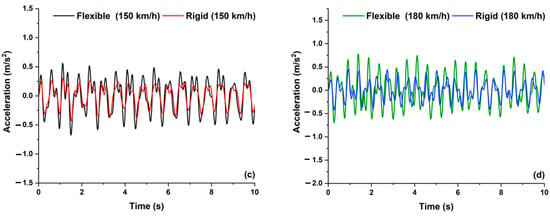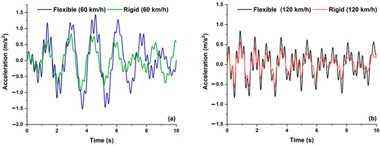 The acceleration response at the vehicle body’s mass center for both the rigid and flexible car body centers was compared at speeds ranging from 60 km/h to 180 km/h. The results show that for all speeds, the acceleration response was higher for the flexible car body than for the rigid car body. At 60 km/h, the acceleration response for the flexible car body was 0.54 m/s2, while for the rigid car body, it was 0.48 m/s2. Similarly, at 120 km/h, the acceleration response for the flexible car body was 0.68 m/s2, while for the rigid car body, it was 0.59 m/s2. At higher speeds of 150 km/h and 180 km/h, the difference in acceleration response between the two car bodies was even more significant, as shown in Figure 6. The dissimilarities between the real high-speed train vehicle and the rigid model arise from the fact that the train’s car body experiences flexible resonances stimulated by track irregularities or bogie system vibration, which cannot be accurately accounted for in a rigid model.