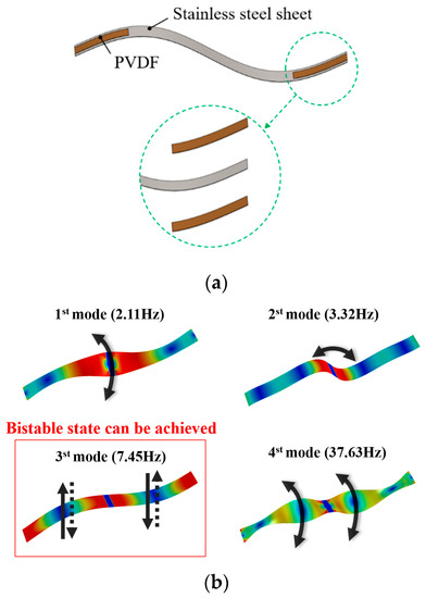 In order to improve the performance of the energy harvester, nonlinear technology is the main way used to enhance the efficiency of energy conversion. The common method is to alter the potential shape of the harvester by providing pre-tightening force or pre-deformation. A generator beam designed as a bistable “S” type energy harvester is proposed here to effectively convert low-frequency, low-amplitude, random vibrations into electricity, as shown in Figure 1a.