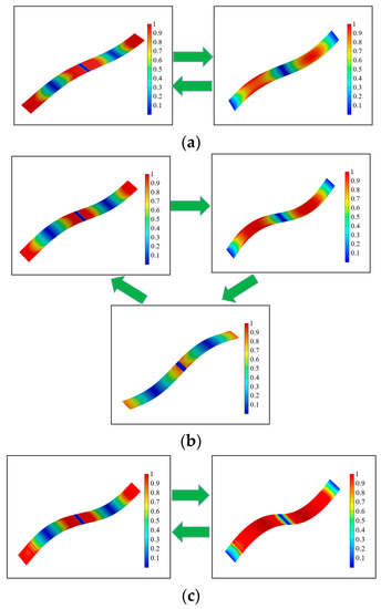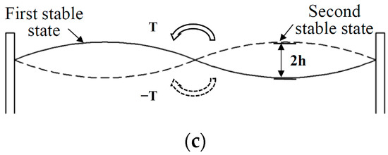 The third mode of generator beam is used in the design of energy harvester as an ideal energy harvesting motion. The generator beam is imposed a pre-deformation of the “S” shape by the clamped columns on both sides, thus having two steady states, when the harvester is excited by the environment, it can perform either small-amplitude motions within a single potential well (intra-well motion) or large-amplitude motions between the two potential wells (inter-well motion), as shown in Figure 1c. The occurrence of inter-well motions requires breaking through potential energy barriers (snap-through), which constitutes a typical bistable structure. Upon suitable environmental stimulus, snap-through occurs and the beam changes from one stable state to the other. A large amplitude of oscillation and a local high-frequency vibration accompanies this process, allowing the harvester to output greater electrical energy.