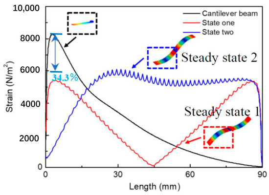 To solve the above problems, the finite element method (FEM) method is used to compare and calculate the stress changes of the cantilever beam and the S-type generator beam of the energy harvester proposed in this paper during the movement. When the two forms of generating beam reach their own resonant frequencies, the maximum stress curve of the generating beam during the movement is shown in Figure 3. The cantilever beam appears obvious stress concentration phenomenon in the movement process, and the position of stress concentration remains unchanged, even if the beam moves; In contrast, the position of the peak stress of the S-type generator beam proposed in this paper is constantly moving with the change of the movement process (from steady state 1 to steady state 2), which can make full use of materials to avoid premature fatigue failure of materials caused by stress concentration. In addition, as far as the peak stress is concerned, the peak stress of the S-type generator beam is 34.3% lower than that of the cantilever beam, which shows the great potential of the S-type generator beam in improving the fatigue failure of materials.
