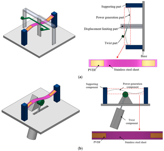 To drive the beam, the energy harvester is designed to provide suitable torque to the middle of the S-beam. As shown in Figure 4a, a “U”-shaped torsional beam is designed to be bonded in the middle of the generator beam in the up and down vibration excitation environment. The torsional beam absorbs the vibration excitation in the environment and converts it into the torque applied in the middle of the generator beam, driving the generator beam to move and generate electric energy. Thus, in addition to the design of supporting parts (the base and columns), the energy harvester also has a limit device in the middle of the beam to ensure that the beam moves in the desired way. The base of the “S”-type power generation beam is made of 301 stainless steel with a thickness of 0.1 mm. The two ends of the power generation beam are pasted with PVDF piezoelectric plates to convert motion energy into electric energy.