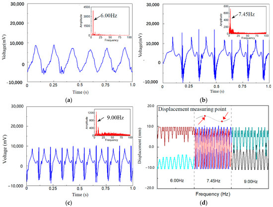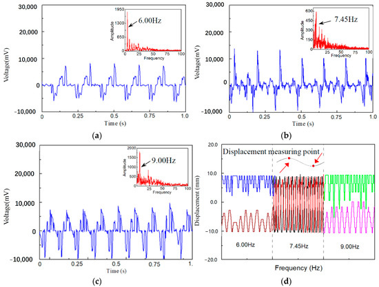 Test results of vibration excitation: (a) F = 6 Hz (The excitation frequency); (b) F = 7.45 Hz; (c) F = 9.00 Hz; (d) Displacement of two vaults of generator beam at different excitation frequencies (Different colors enhance visual comparison of measurements at different positions/frequencies).