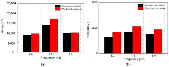 In order to comprehensively evaluate the performance of the S-type generator beam in two environments (The up-and-down vibration excitation and the wind-induced vibration excitation), a specific mode (3st mode, 7.45 Hz) and a typical low-frequency environmental excitation (6.0 Hz and 9.0 Hz) are applied to the two energy harvesters containing the S-type generator beam. The experimental results are shown in Figure 6 and Figure 7.