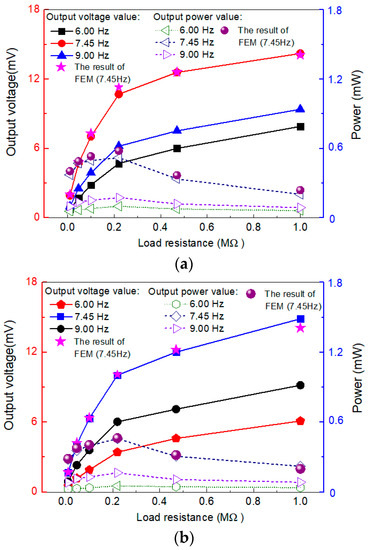 The output performance of the harvester at different circuit load conditions: (a) The up-and-down vibration excitation; (b) The wind-induced vibration excitation.