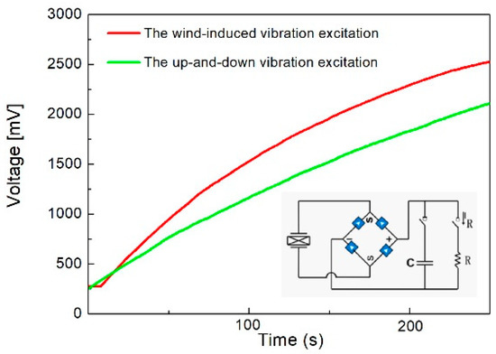 To verify the energy harvesting capability of the two energy harvesters, a 470 μF capacitor was used to collect energy with an excitation frequency of 7.45 Hz. A full bridge circuit to change alternating current (AC) to direct current (DC), as shown in Figure 10. After 100 seconds of charging, the capacitor voltage reached 1210 mV with the energy harvester at up-down excitation environment (7.45 Hz), and the capacitor charging voltage with the energy harvester at wind excitation environment (7.45 Hz) increased by 26.4% to 1530 mV. Further, after 200 seconds of charging (7.45 Hz), the capacitor voltages are 1820 mV and 2290 mV, respectively. In the same environmental excitation frequency, the energy harvester efficiency of the S-type generator beam in a wind environment is better than that of up-and-down vibration excitation environment. This is because in wind environment, the force of VIV received by the blocking fluid can be more fully transmitted to the middle of S-type generator beam in the form of torque, resulting in more high-frequency vibration.