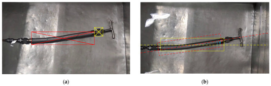 The ROI area partially corresponds to the metal hose. The detection frame is too large when the metal hose is tilted. The ROI area is corrected to conform to the tilted metal hose, as shown in Figure 2. The yellow box represents the nut area. The red box is the net sleeve area. When there is a deviation in the pressure vessel in the prediction box, as shown in Figure 2b, the center lines of the yellow and red boxes form a certain deflection angle θ, and the red ROI area is rotated counterclockwise according to the deflection angle to correct the target box. The ROI correction formula is as follows: