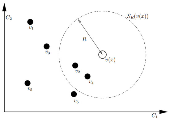In the step of foreground detection, the Euclidean distance between the corresponding pixel points can be found by comparing the following image pixel values with the background model. The number of sample points is counted, as the Euclidean distance is less than the fixed threshold R in Figure 3. If the number of sample points is less than the set threshold, the pixel is determined as the foreground point; otherwise, it is determined as the background point. The determination formula is as follows: