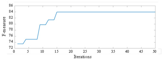 The particle swarm algorithm had 50 iterations and a population of 10, and the parameters , and were optimized within [0.05,0.3]. The F-measure value was a combination of accuracy and recall, which was the target of the calculation and better reflects the comprehensive evaluation of the image algorithm. Finally, = 0.188, = 0.05 and = 0.05 were used as the optimized parameter values. The F-measure value obtained according to the PSO algorithm was 83.97%, as can be seen in Figure 7.