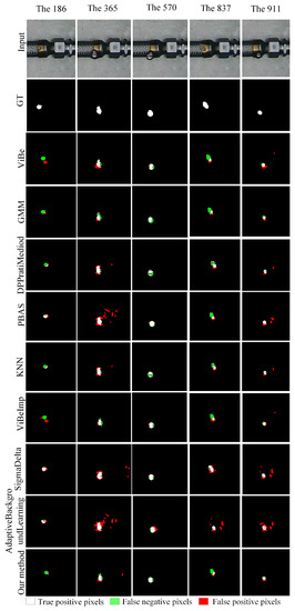 In Figure 9, the frames 186, 365, 570, 837 and 911 are shown to compare each algorithm. In the figure, white indicates that the target has been correctly detected, green indicates that the target has been misjudged as a nontarget, and red indicates that the actual nontarget has been underestimated as a target.